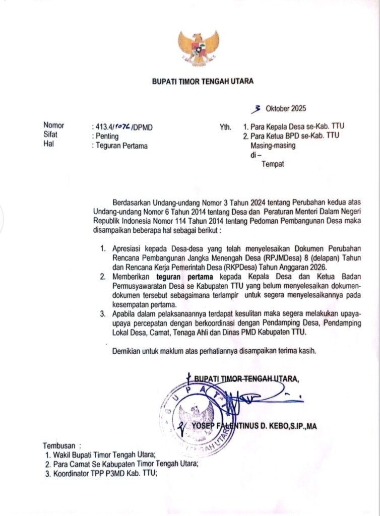 Besorah news (7/10/2025) Bupati Timor Tengah Utara, Yosep falentinus Delasalle Kebo,S.IP.M,A telah mengeluarkan surat resmi bernomor 413.4/1076/DPMD yang memberikan teguran pertama kepada 75 desa yang belum melakukan Musyawarah Desa Penetapan Rencana Kerja Pembangunan Desa (RKPDes) untuk pemanfaatan Dana Desa tahun 2026. Hal ini disampaikan oleh Kepala Bidang Keuangan dan Aset Desa Dinas Pemberdayaan Masyarakat dan Desa (DPMD) TTU, Agung Benu, S.STP, dalam sebuah evaluasi perencanaan pembangunan desa yang diadakan bersama Tenaga Ahli Program Peningkatan Pembangunan Masyarakat Desa (P3MD) TTU.